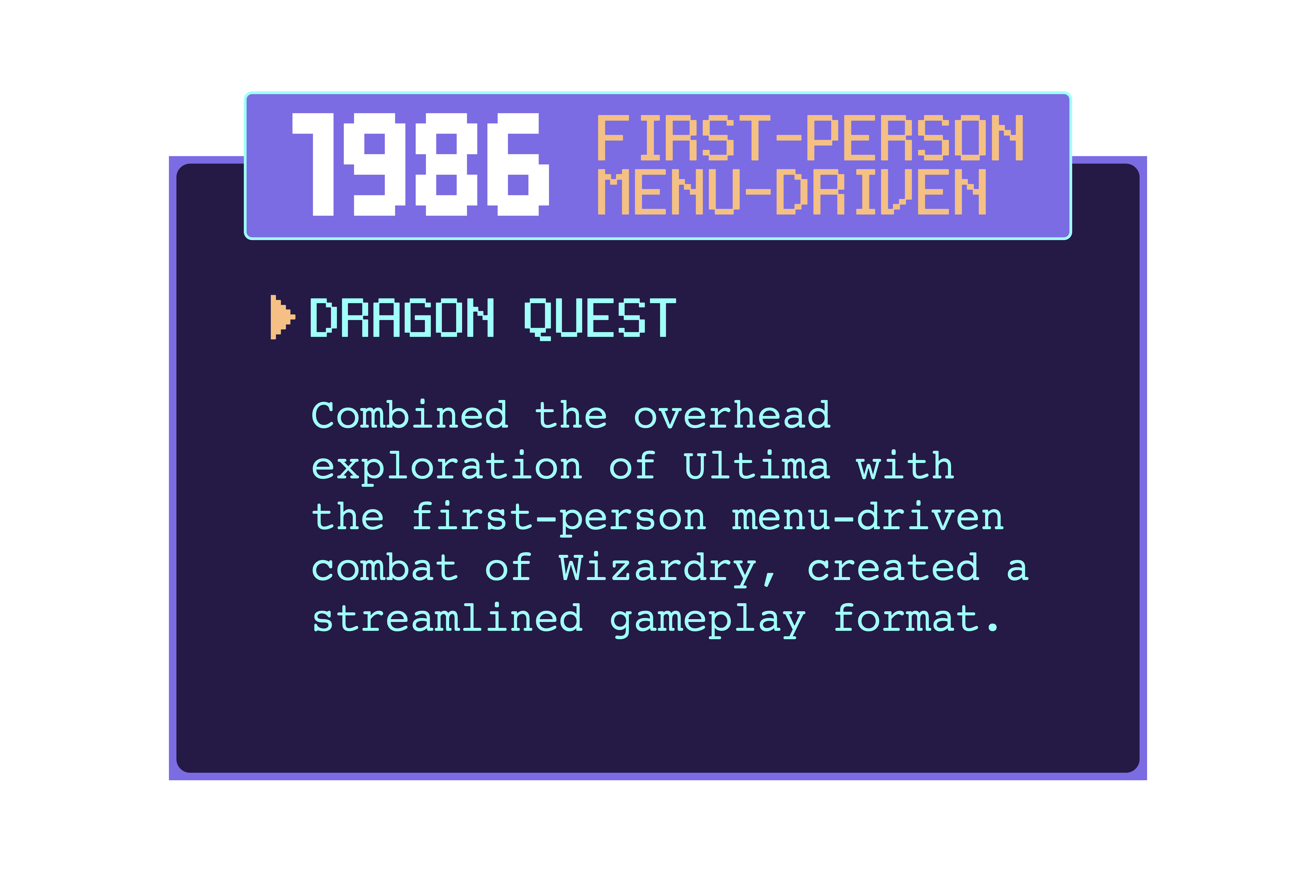 Designed for gaming enthusiasts, this infographic presents a timeline of new inventions in Japanese Console Role-Playing Games, linking various layers of information through engaging pixel graphics and dialog boxes.